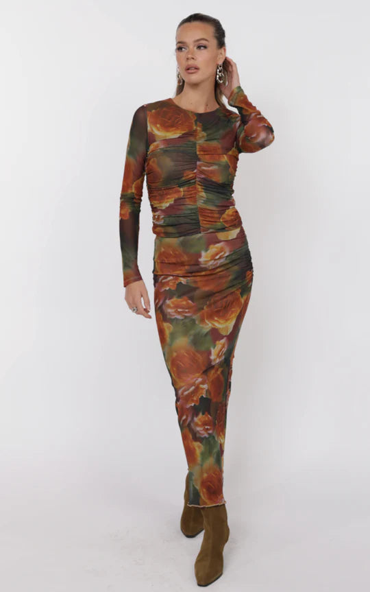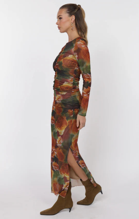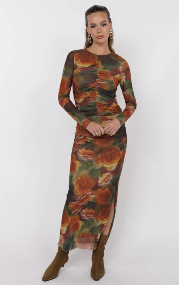 Turn heads in the Heart Beats Side Slit Skirt—a sheer mesh midi featuring a sultry rose print in deep autumn tones. Designed with delicate ruching and a thigh-high side slit, this skirt balances romantic flair with an edgy finish. Fully lined and ultra flattering, it’s perfect for date nights, art events, or styled up for evenings out.