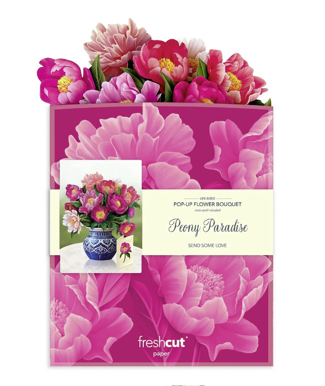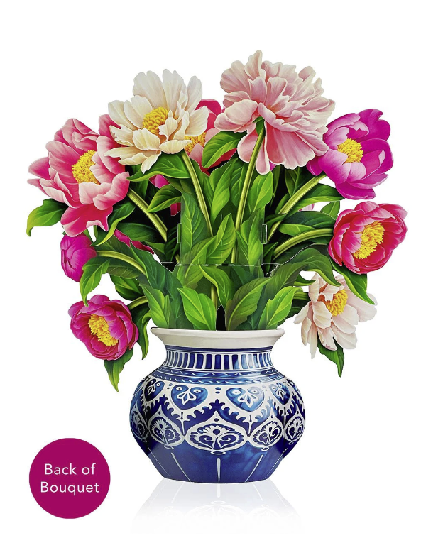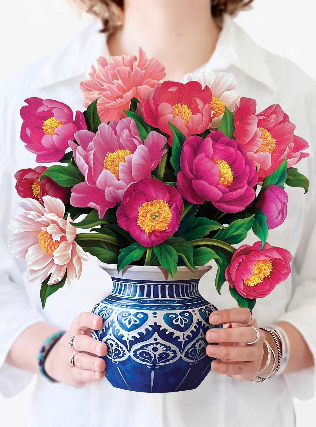 Vivid and dramatic, this luxurious display of blooming peonies will transport you to paradise! Comes complete with decorative indigo and white pot and matching note card. Symbolic of bliss and beauty, this is the perfect arrangement to wow your loved ones. Comes with coordinating blank card. Mails flat in a vibrant envelope.
