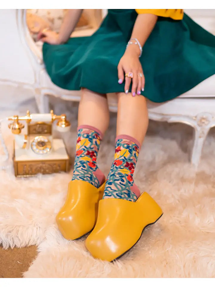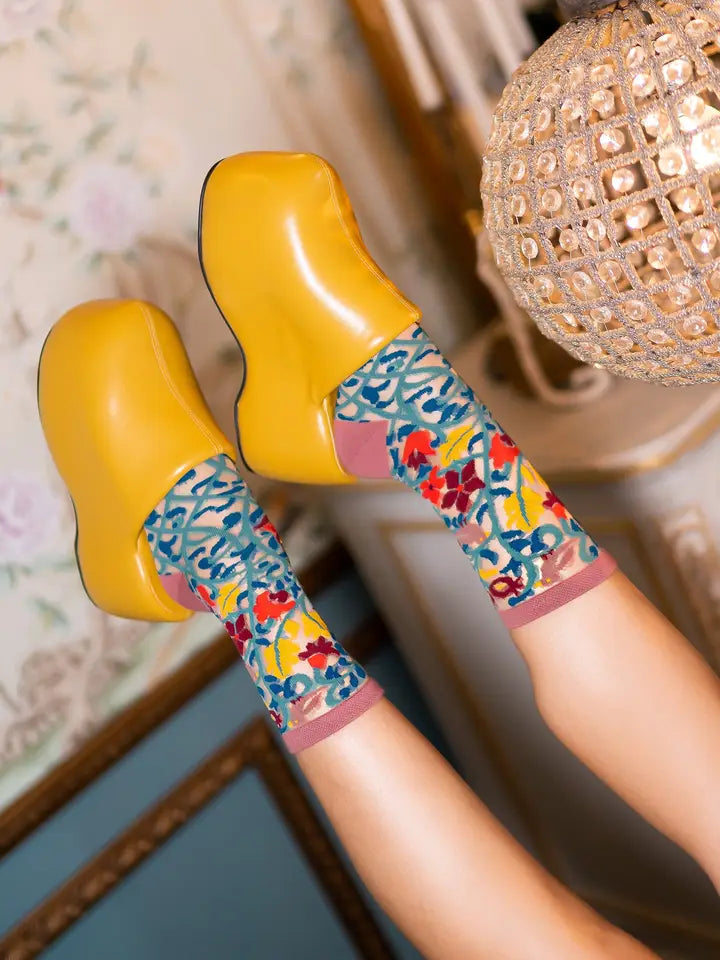 Vintage tapestry vines form into Fall florals, vibrant buds, and whimsical birds on this earthy sheer sock. The duo print design allows you to change up your look and pair with everything from chunky clogs to ankle boots. A bohemian color palette gives this tapestry print sock a free-spirited vibe.