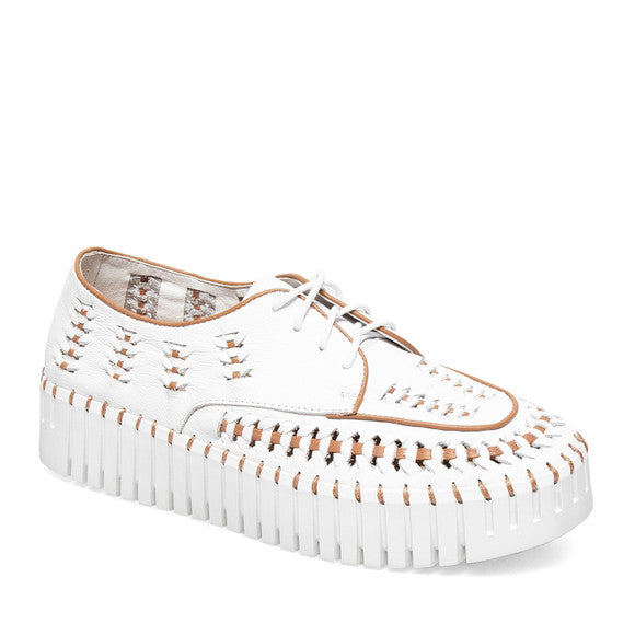 A modern comfort sneaker with a twist! This fashion-forward shoe features soft contrasting woven leather and a flexible platform sole with quality stitching around the trim.