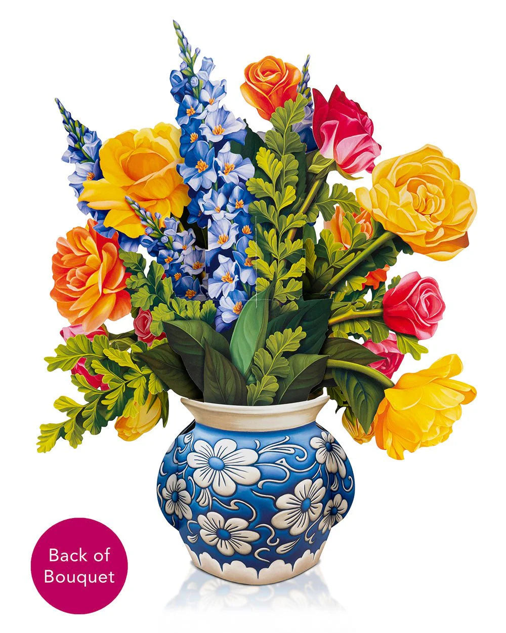 An exquisite arrangement of refreshing roses is a rare beauty to behold and the ultimate way to say “I’m thinking of you.” Elegantly gathered together with blue snapdragon accents, raspberry red, tangerine orange, strawberry pink, and limoncello yellow radiate out from standard and garden roses in a fitting blue and white floral vase. Symbolic of passion, courage, and love, FreshCut Paper’s Sorbet Roses are a fresh and sweet delight that brighten up every space they bloom in.