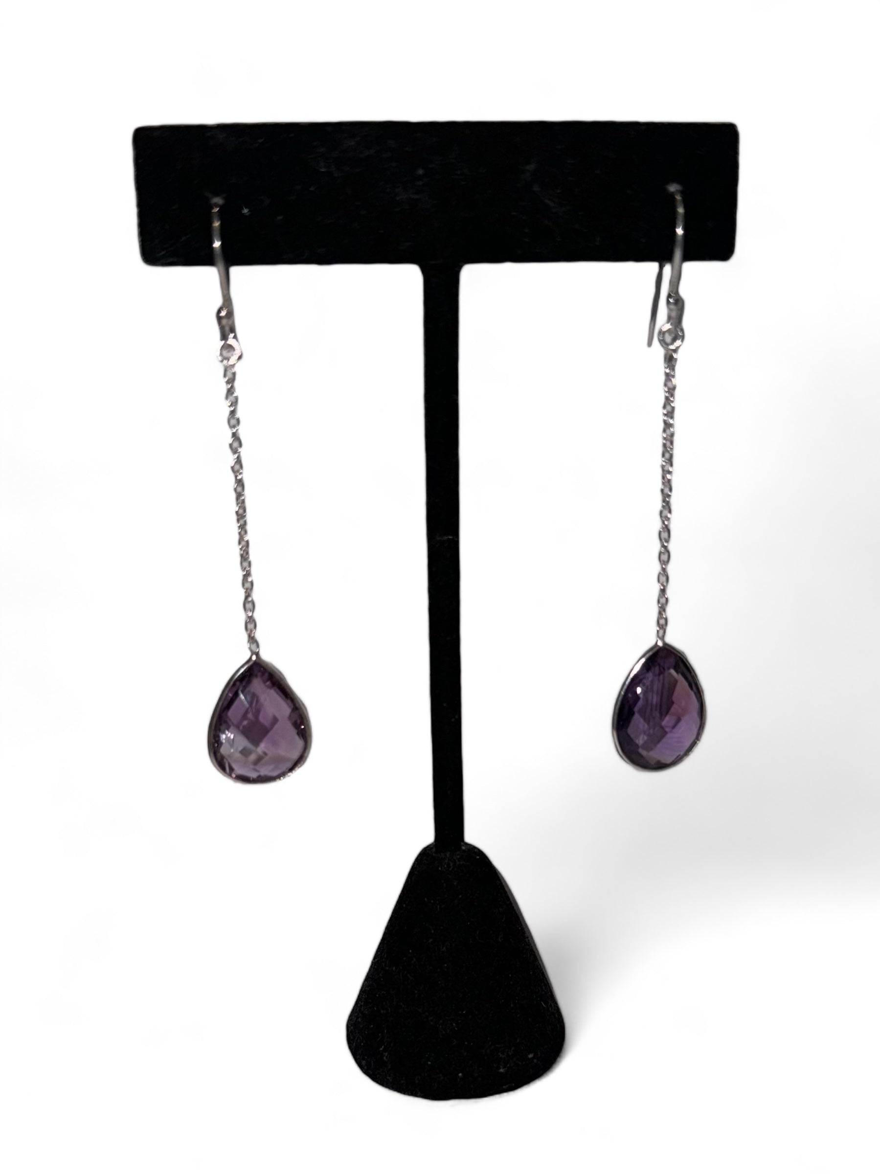 Sterling silver hook earring set with faceted Amethyst drop pendants and a sterling silver chain dangle.