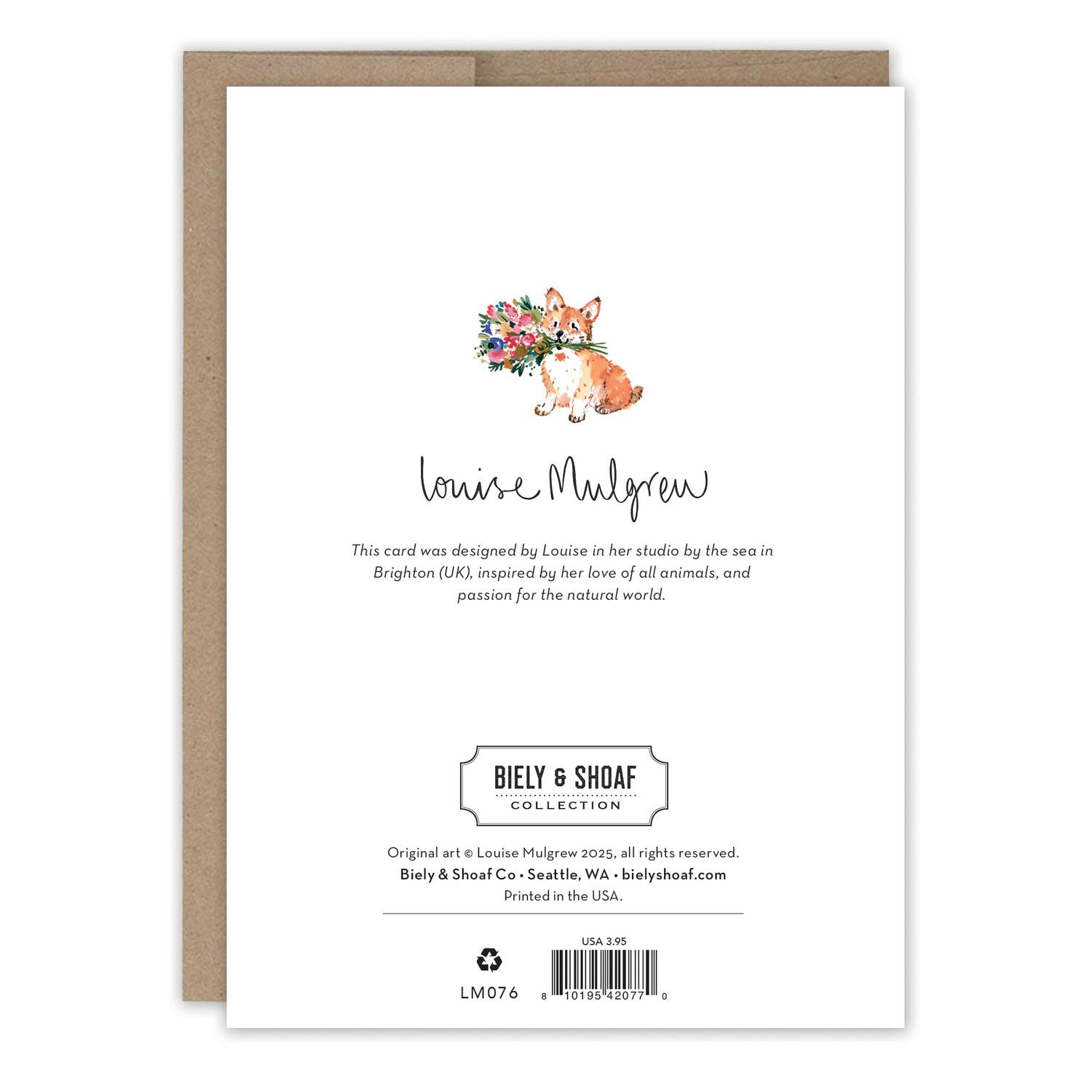 Blank inside for your own message • Illustrated by Louise Mulgrew • Pre-priced • Size: A6, 4.5" x 6.25" • Paired with a Kraft envelope • Printed in the USA. About the artist: Working with gouache and watercolor, Louise designs in her tiny studio in Brighton, England, inspired by her love of all animals, and passion for the natural world. Louise was named 2023 Artist of the Year by the USA Greeting Card Association.
