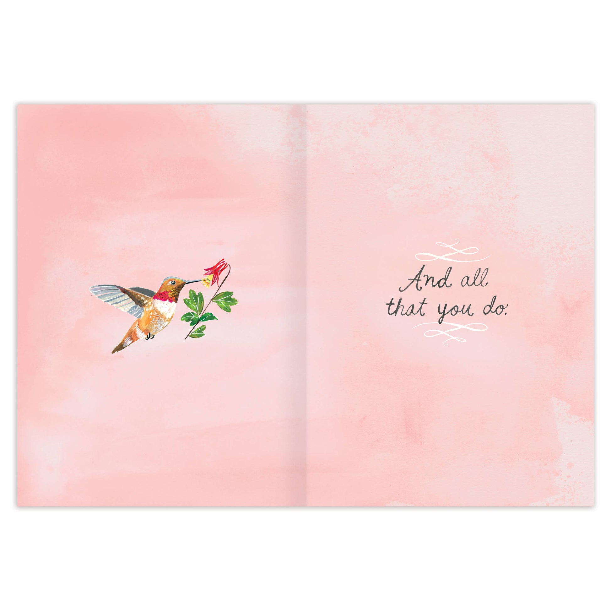 Inside verse: And all that you do. • Size: A6, 4.6" x 6.4" • Illustrated by Katie Daisy • Full-color inside • Envelope color: Brown Kraft • Printed in the USA on high-quality recycled post-consumer waste paper • Pre-priced •. About The Artist: Katie Daisy was raised by the birds and warm breezes of small-town Lindenwood, Illinois, brought up among the wildflowers with roots planted deeply in the natural world. She found her voice and honed her skills at the Minneapolis College of Art and Design, graduating in 2009 and subsequently beginning an adventurous career as a freelance illustrator. Working in watercolor and acrylic paint as well as mixed media materials, Katie strives to capture the magic and beauty of a life lived in harmony with nature.