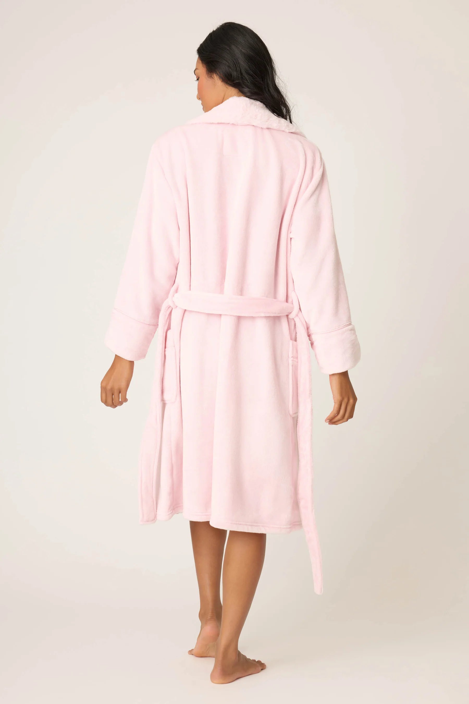 Wrap yourself in cozy, plush comfort. This mid-length robe is made from silky-soft fleece with a shawl collar, a self-tie belt, and roomy patch pockets. The pale, petal-pink hue adds a sweet, soothing touch to your lounge routine.