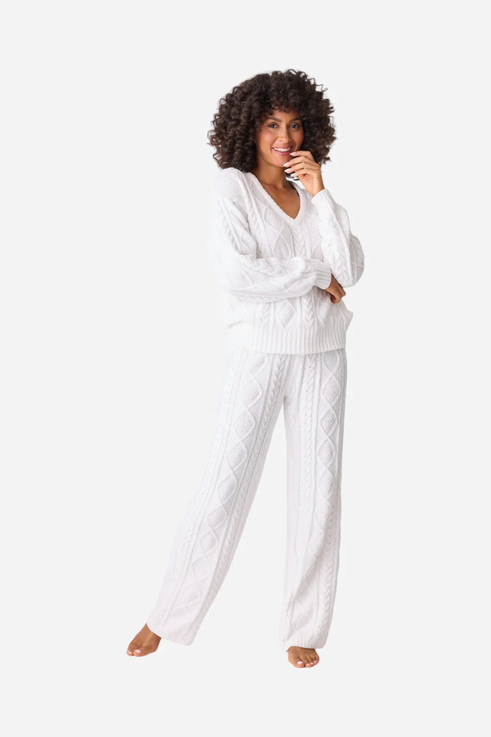 Relax with our chenille cozy cable sweater. It features a beautifully textured cable knit and a graceful v-neck, designed to provide both comfort and style. The rib-knit waistband ensures a flattering fit that enhances any outfit. Add a touch of classic sophistication to your wardrobe with this versatile ivory hue.