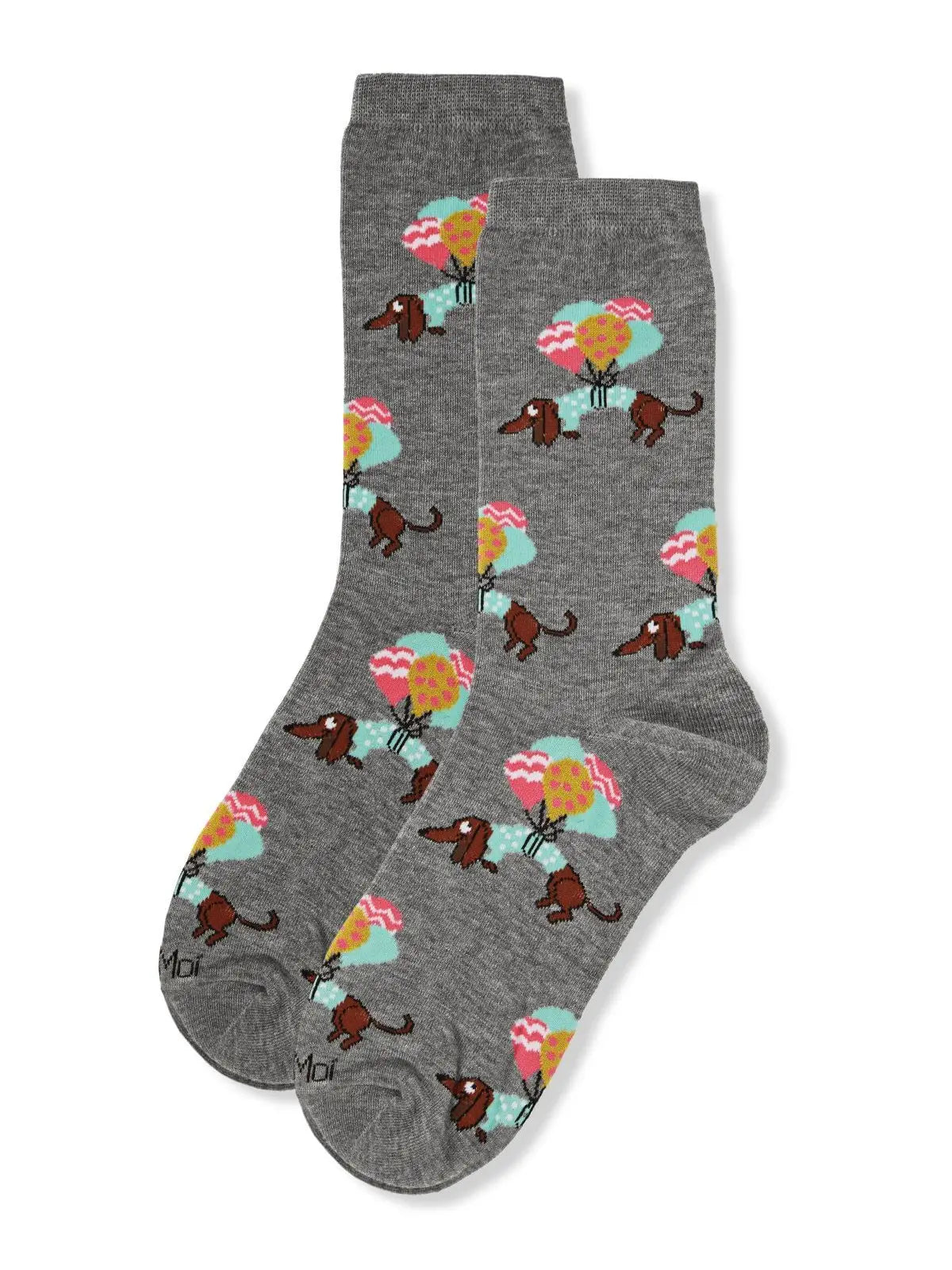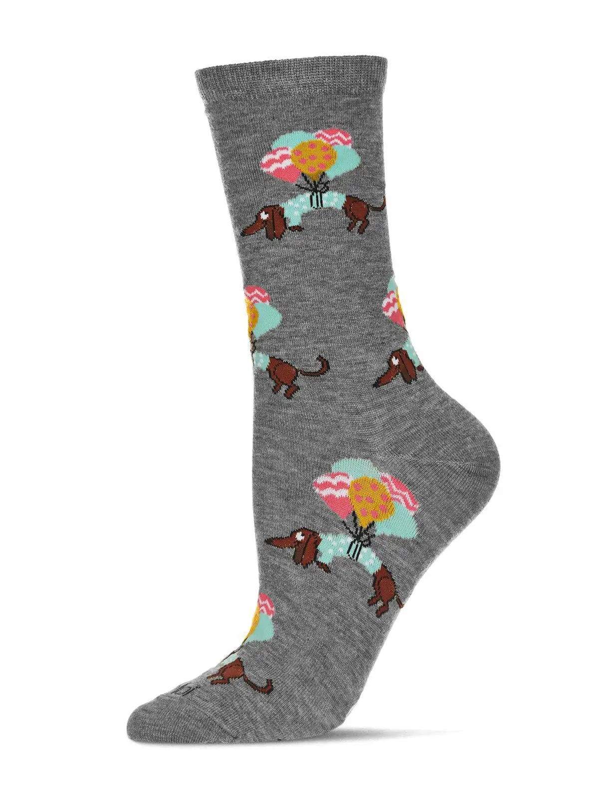 Our Dachshund Float Bamboo Blend Crew Sock is a whimsical, creative bit of flair to break up your sock drawer's monotony. A solid base is printed with an allover pattern of dachshund dogs floating with the help of colorful balloons, which is just a delightful thing to think about, right? Made with a bamboo blend, these socks are eco friendly and get softer with every wash for fun that lasts a while.