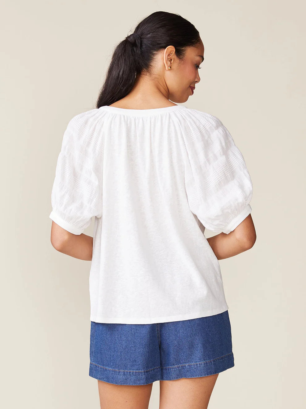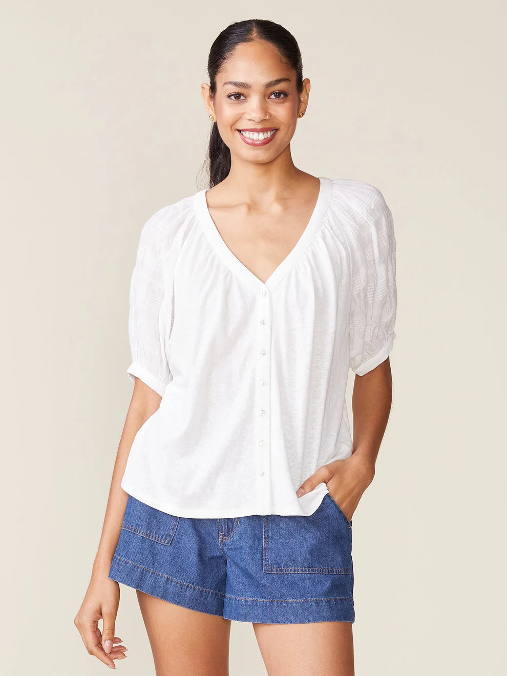 This mixed media knit top is a beautiful and airy summer style. A tonal, textured woven raglan cut elbow sleeve is paired with a linen like knit bodice. The button front detail and gathering around the v neckline turn up the volume on this breezy blouse.