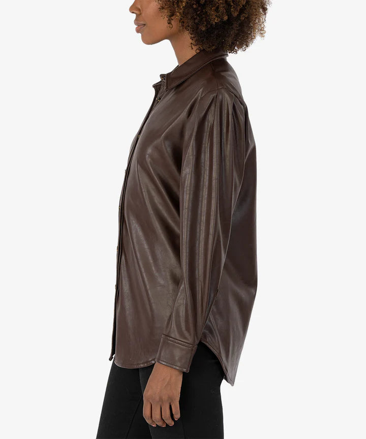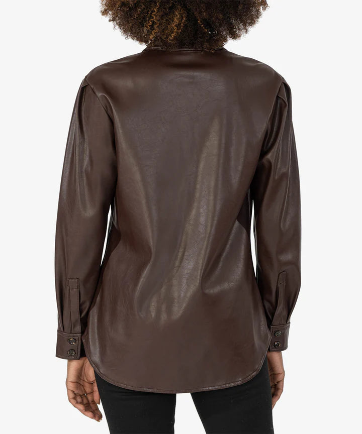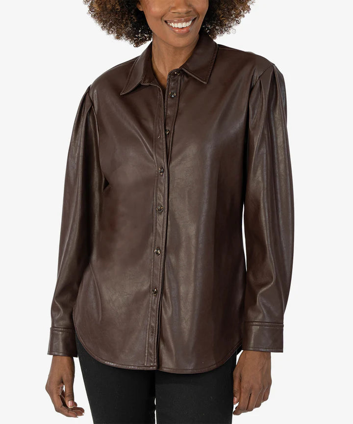 - A sophisticated look for day or night, this button-up shirt flaunts a smooth coating and a chocolate brown hue that create a luxe, leather-like effect.