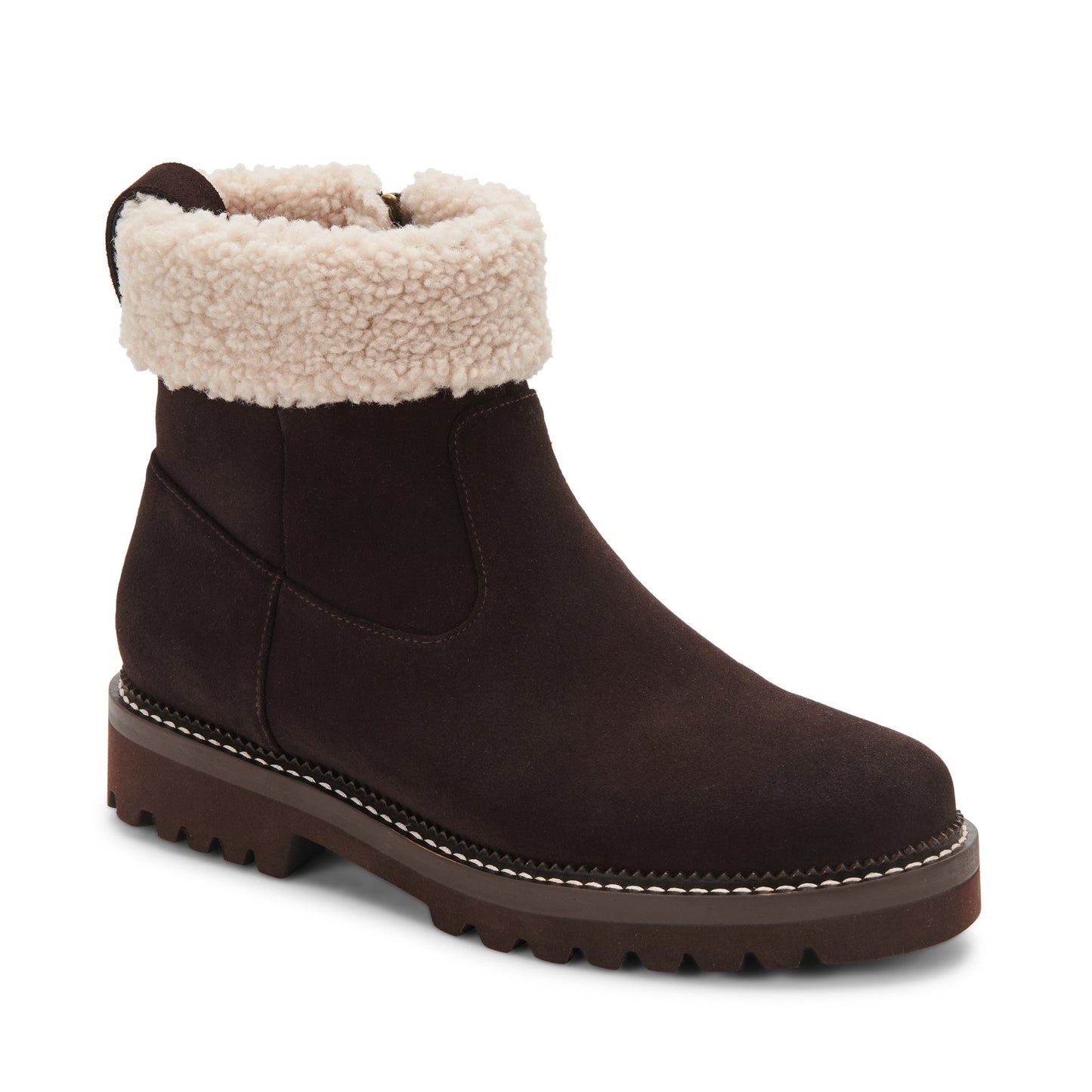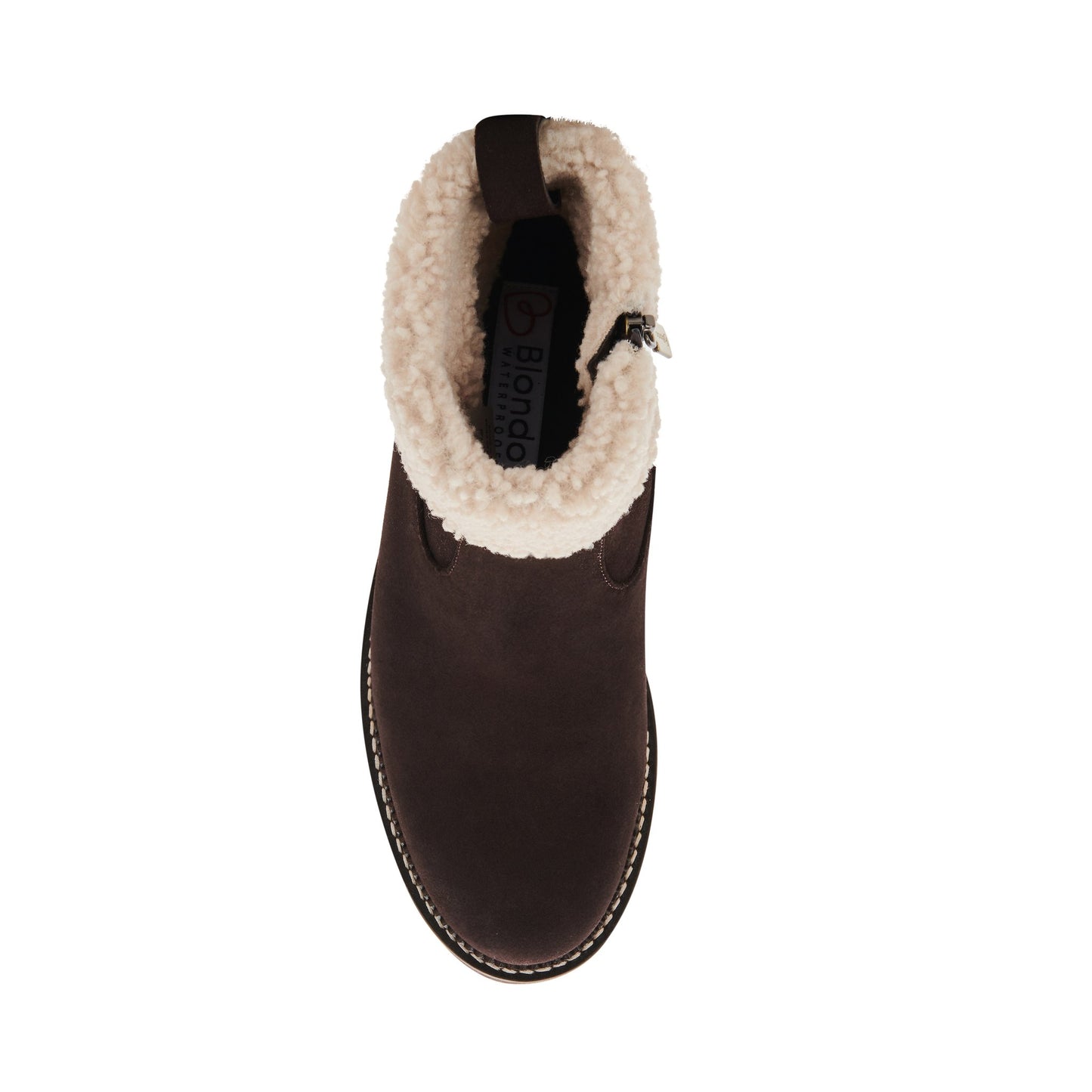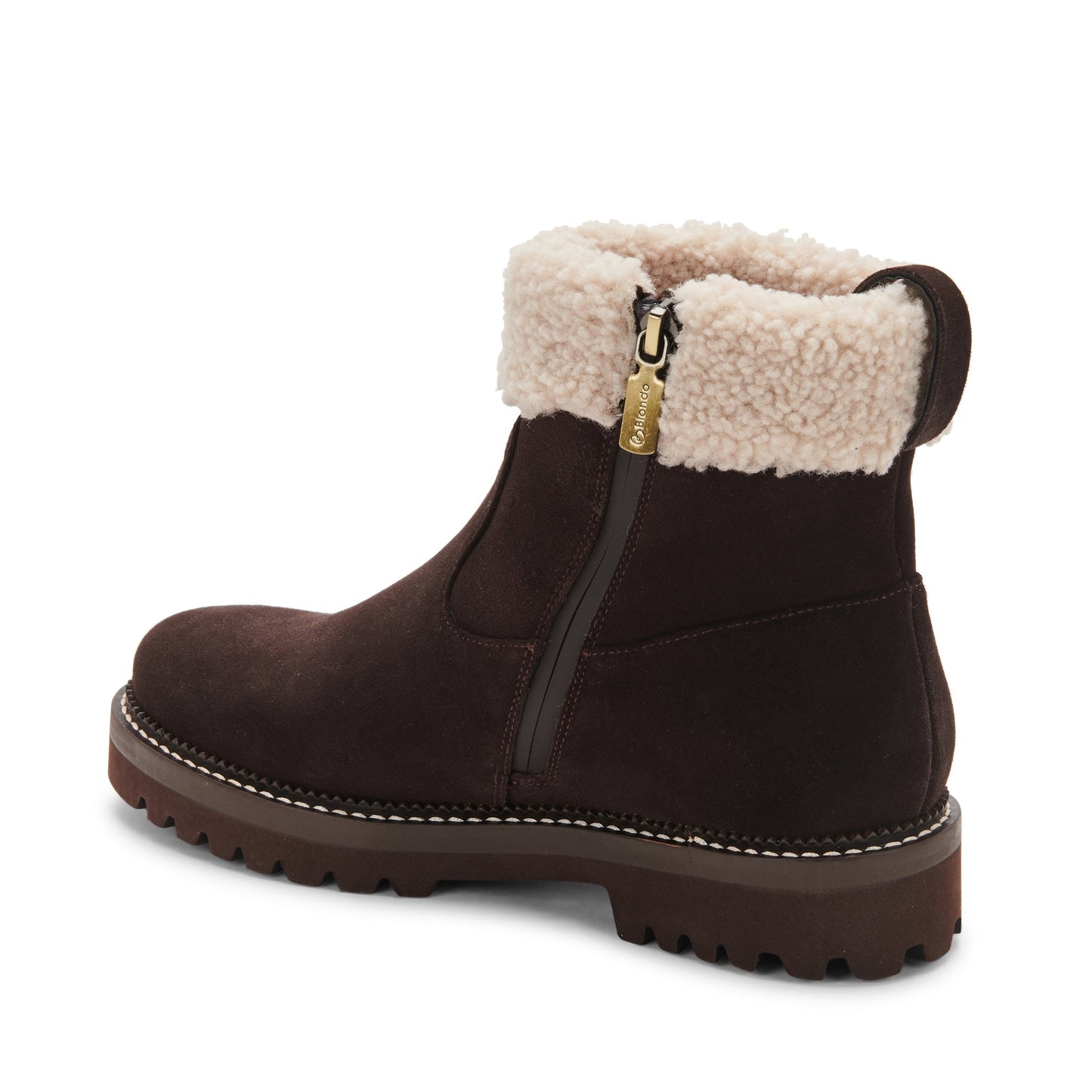 - The Blondo® Harlow Waterproof has easy-care suede that gets a chic faux-shearling trim at the ankle of this weather-defiant bootie set on a grippy lugged sole.
