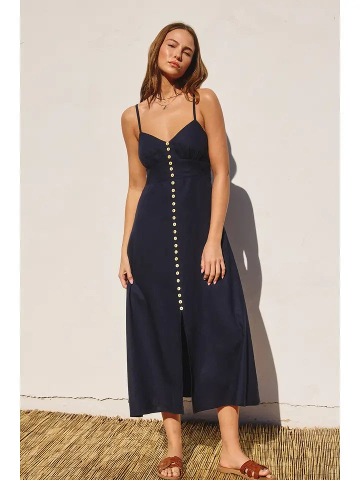 Thin strap V neck dress with center button detail and slit at the hem.