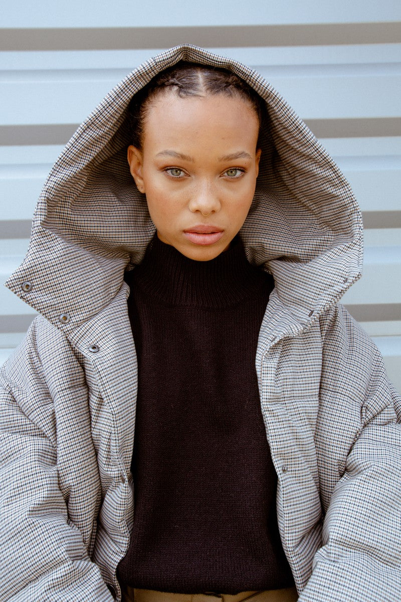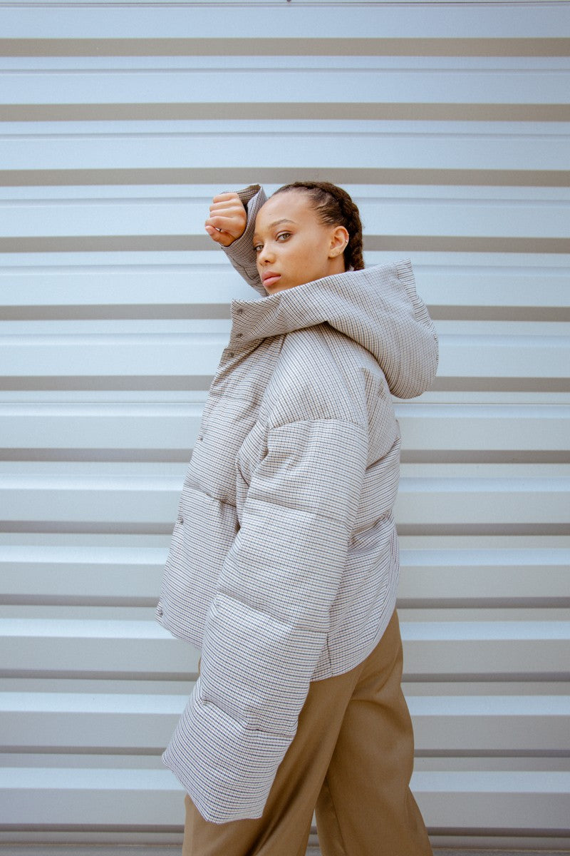 Maxi Puffer Coat, snap front closure, Two front welt pockets, Fixed hood, oversize silhouette