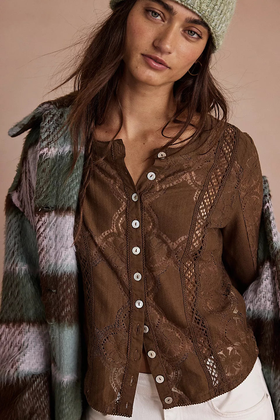 Add a dainty touch to your look with this sheer cotton-lace long sleeve, featured in a button-front style for a versatile piece that’s perfect for layering.