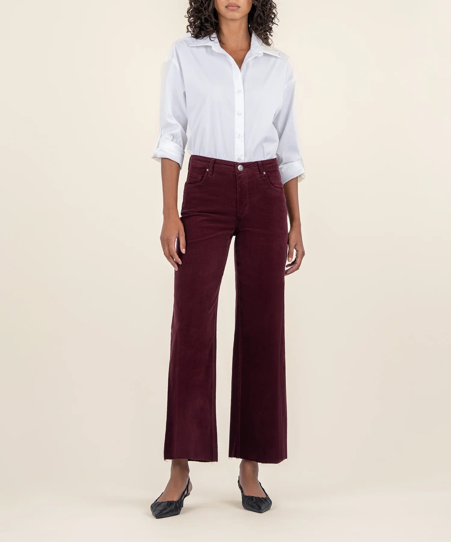 Rock a vintage-chic look in high-rise, ankle flare jeans made from soft corduroy and finished in a rich dark plum.