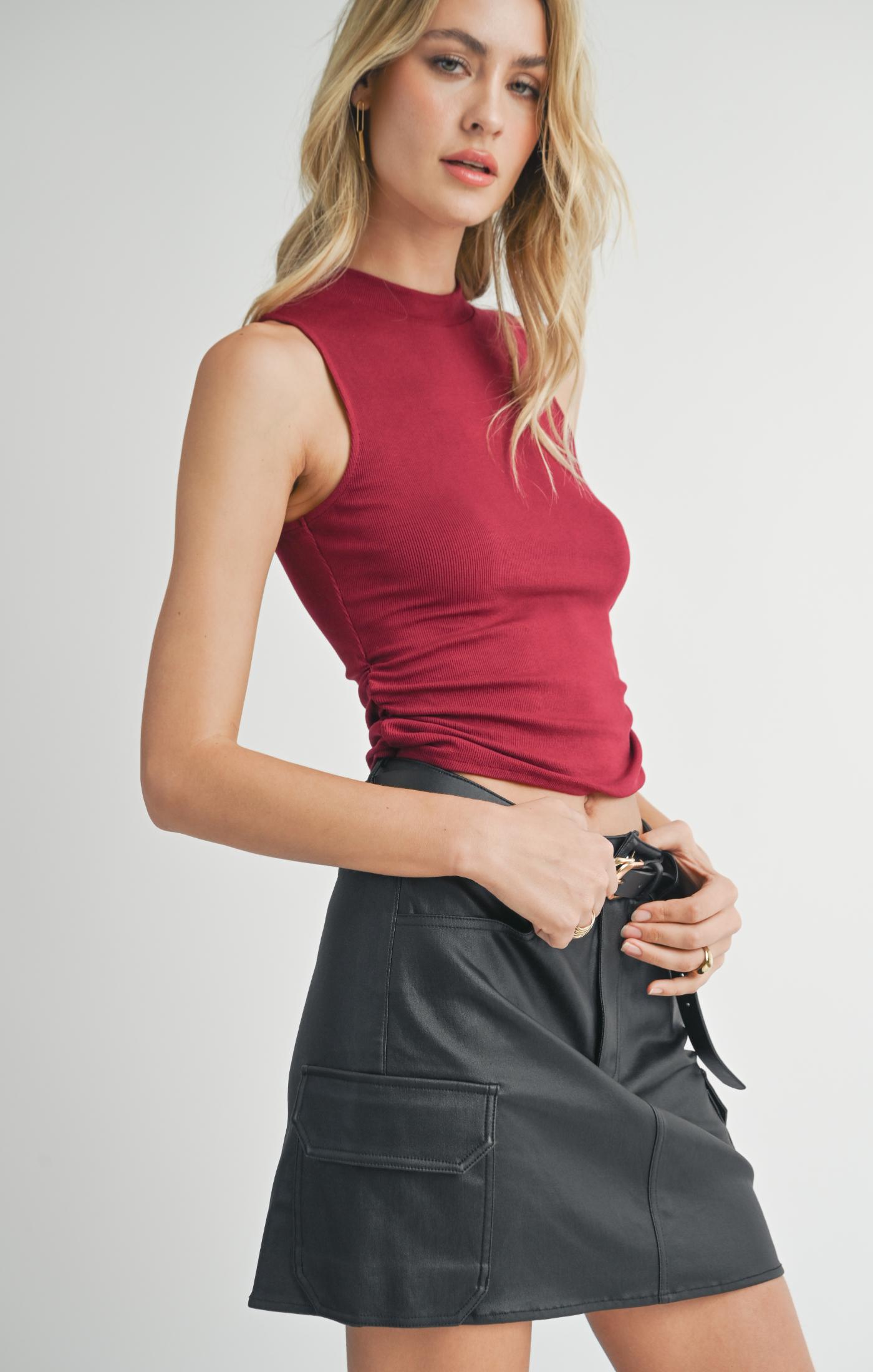 Get ready to rock the look with the RONAN MOCK NECK RUCHED KNIT TANK! This cute tank features ruched sides, a high neck and a rich color that will make any outfit pop. Perfect for layering or wearing on its own, this knit tank is a must-have for any stylish wardrobe. Don't miss out!