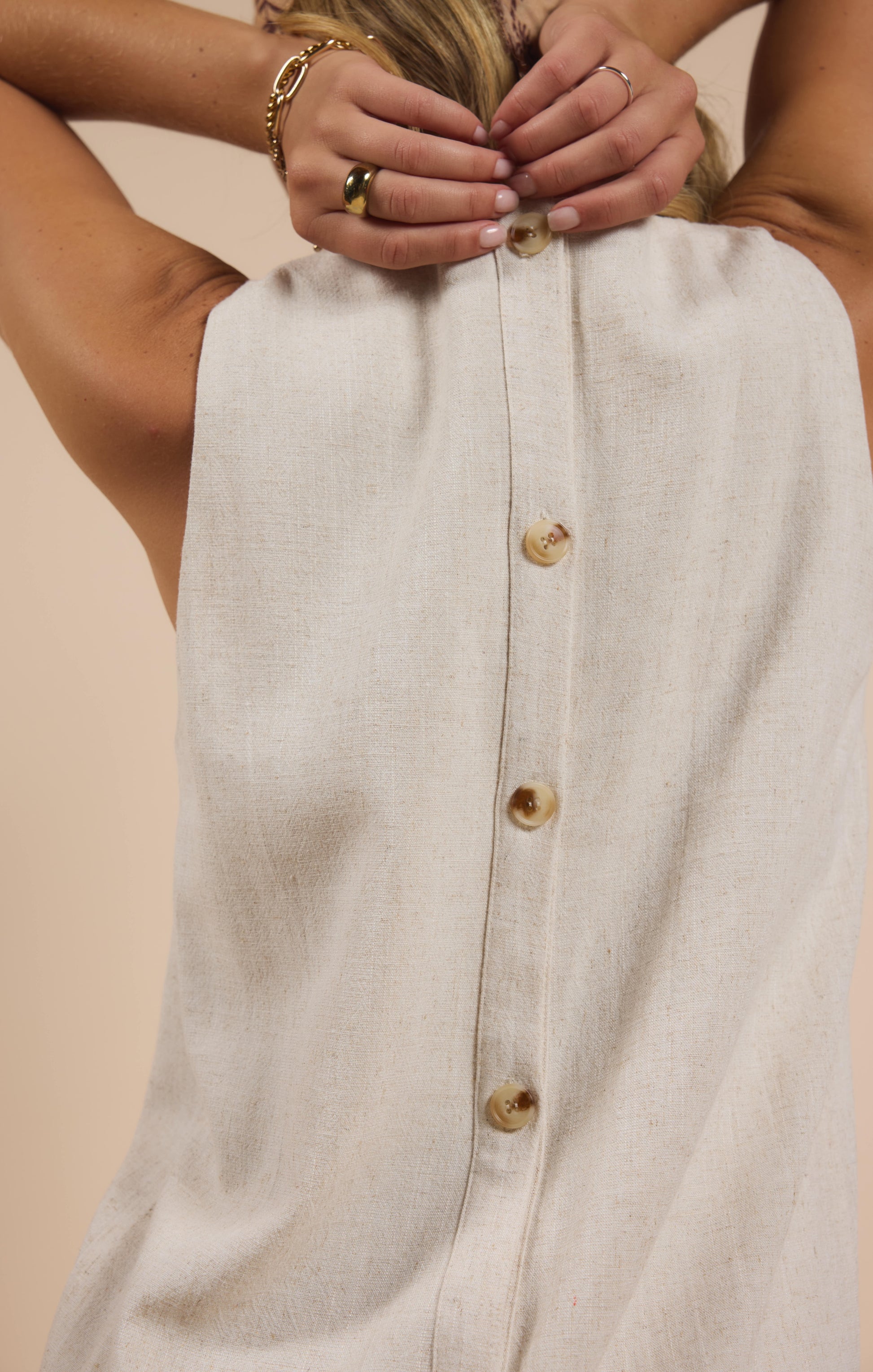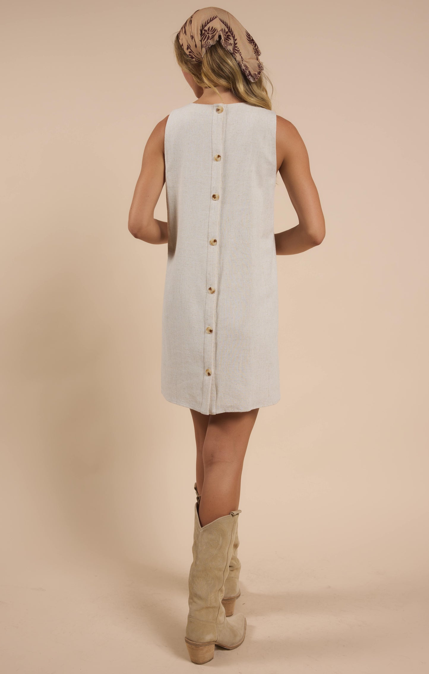 A-line mini dress with back button detail. Fully lined, linen blend.